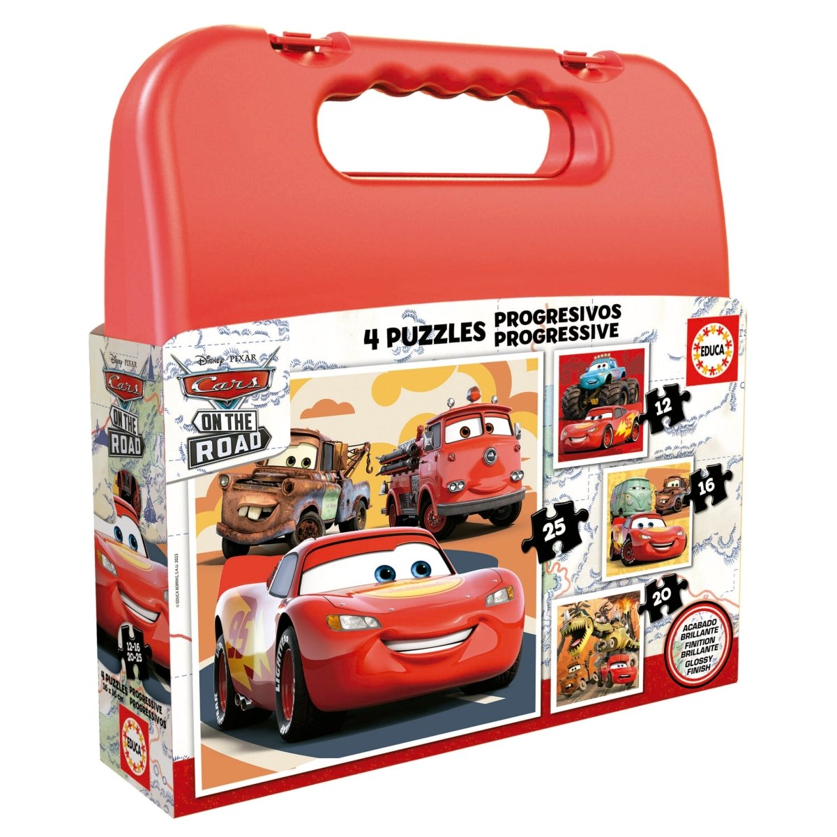 De populære figurer fra Disney/Pixars Biler er tilbage i dette flotte puslespilssæt, som leveres i en praktisk plastkuffert. Perfekt til små fans af Lynet McQueen og vennerne fra Radiator Springs! Æsken indeholder 4 puslespil med henholdsvis 12, 16, 20 og