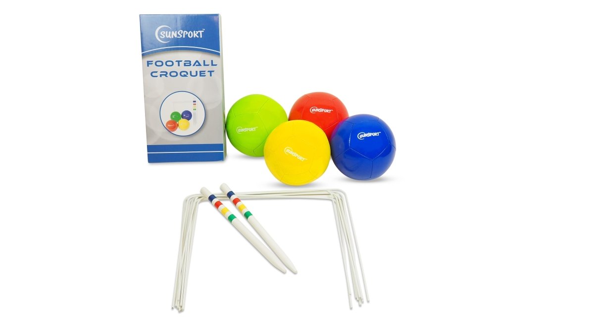 Fodbold Kroket: Spil kroket med fodbolde! Fodbold Kroket er en helt ny version af kroket. Et underholdende udendørs spil for hele familien. Alle kan være med til Fodbold Kroket, og det er især en fordel for dig, hvis du allerede er super god til fodbold.