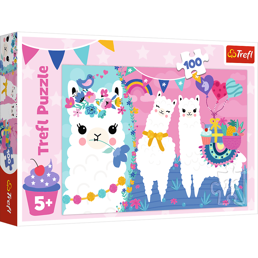Dansk titel: Glade lamaer Antal brikker: 100 Producent: Trefl Størrelse samlet: 41×28 cm