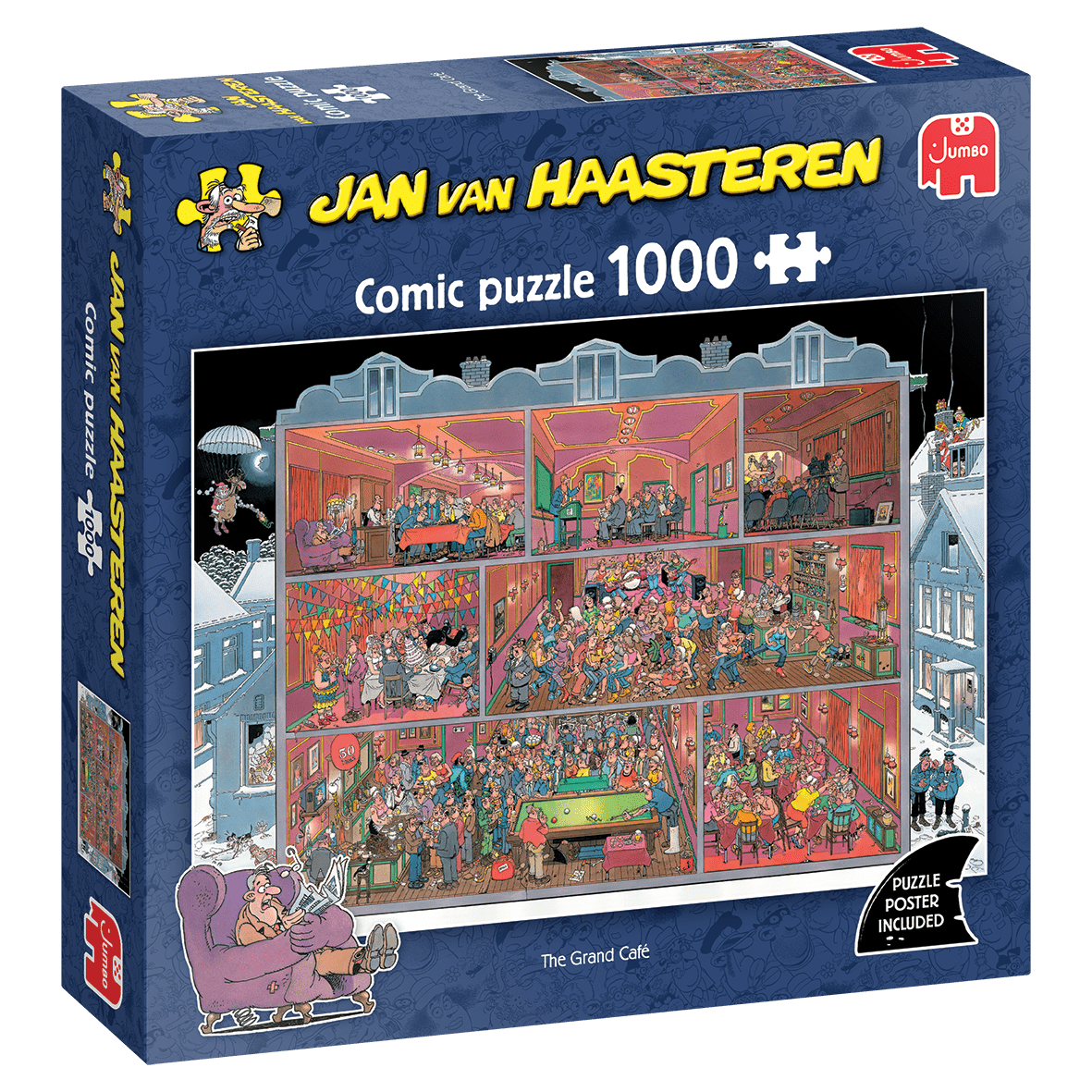 Der er gang i The Grand Café! Overalt i den store bygning summer det af liv, latter og musik. I de forskellige rum bliver der spist, danset, spillet billard og hygget på livet løs og som altid hos Jan van Haasteren går det ikke helt stille for sig. Motiv
