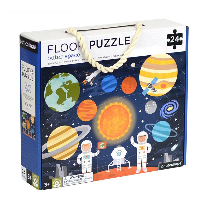 Dette gulvpuslespil med store brikker skaber et sjovt rymdmotiv med planeter, raketter, astronauter og meget mere! Puslespillet består af 24 brikker og måler 610×460 mm, når det er færdigt. Puslespillet kommer i en fin gaveæske med et rebhåndtag (263x235x