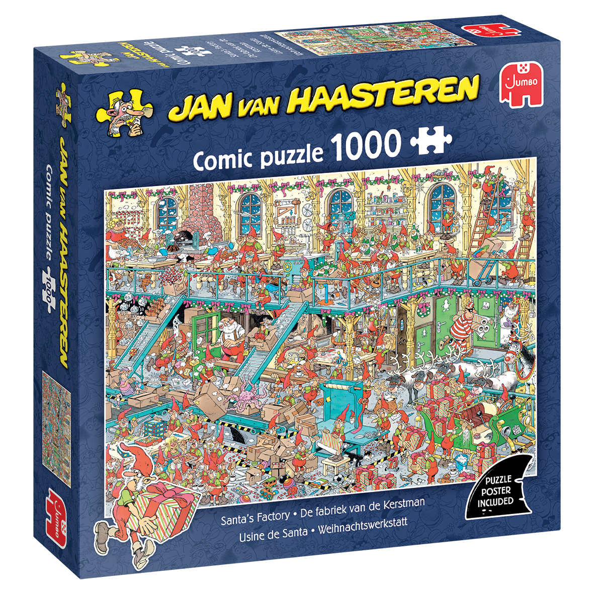 Der er fuld gang i julemandens legetøjsbutik, hvor travlheden med at pakke alle gaverne når sit højeste. Overalt summer værkstedet af liv, og som altid i Jan van Haasterens univers er der skøre detaljer og små historier gemt i hver eneste krog af motivet.