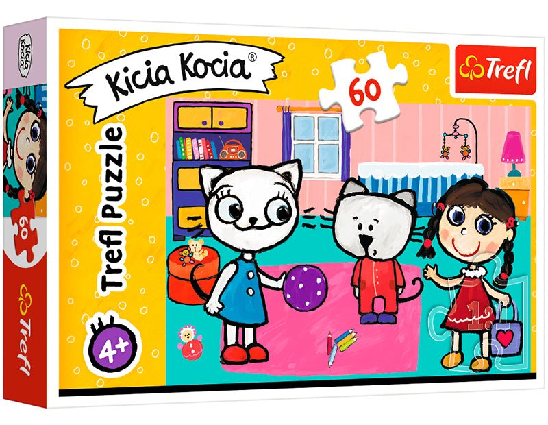 Dansk titel: Kicia Kocia med venner Antal brikker: 60 Producent: Trefl Størrelse samlet: 33×22 cm