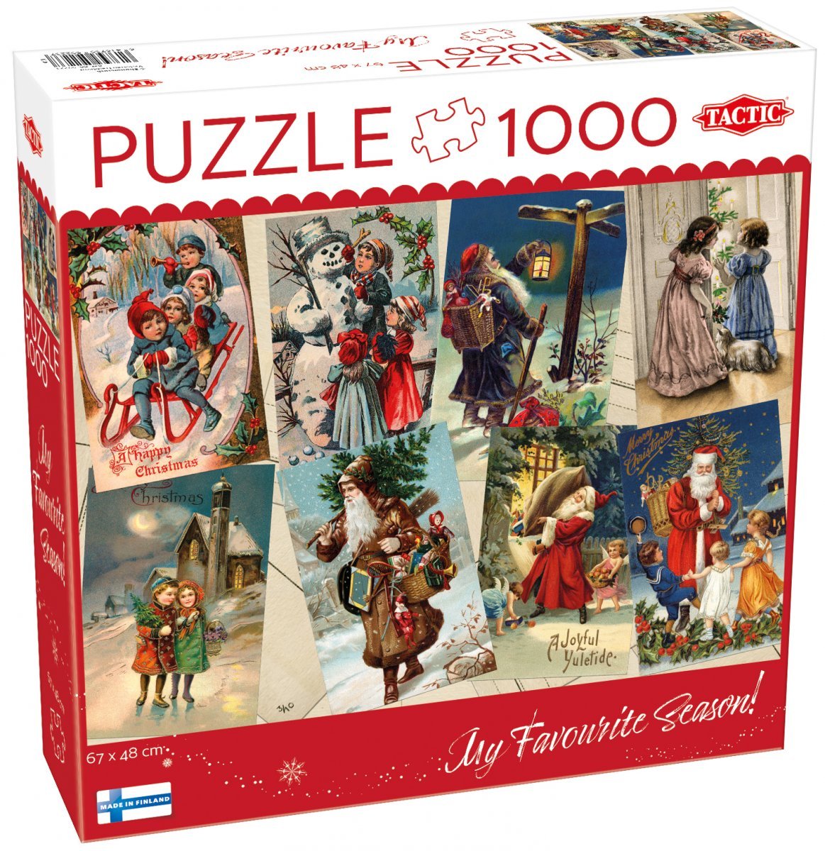 Dette puslespil samler nostalgiske julekortmotiver i ét charmerende collage-design. Klassiske julefigurer, snemænd, juletræer og hyggelige vinterlandskaber bringer barndommens julestemning tilbage. Puslespillet har 1000 brikker og måler 67 x 48 cm. Brikst