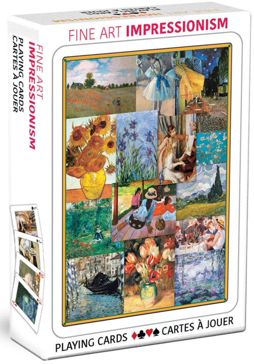 Oplev impressionismens magi, hver gang du spiller et kortspil. Dette elegante sæt spillekort fra Eurographics præsenterer nogle af kunsthistoriens mest elskede værker af mestre som Monet, Degas, Van Gogh, Cézanne og Renoir. Tema & stemning Kortene emmer a