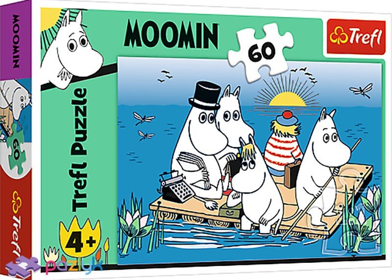Trefl puslespil med motiv af Mumitroldene på en tømmerflåde. 33 x 22 cm.