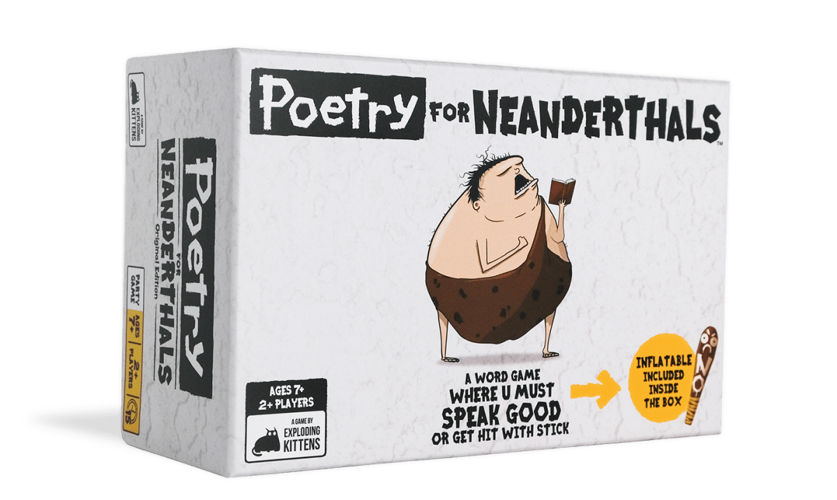 Poetry for Neanderthals – Ordleg for hulemænd I selskabsspillet Poetry for Neanderthals kan du risikere, at dine modstandere slår dig med den oppustelige kølle, hvis du ikke kun siger enstavelsesord. Det må hulemanden prøve at gøre alt for ikke sker. Spil