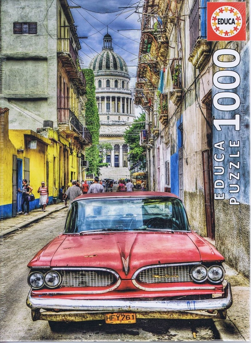 Dansk titel: Vintage Bil i Gamle HavanaAntal brikker: 1000Producent: EducaStørrelse samlet: 48×68 cm